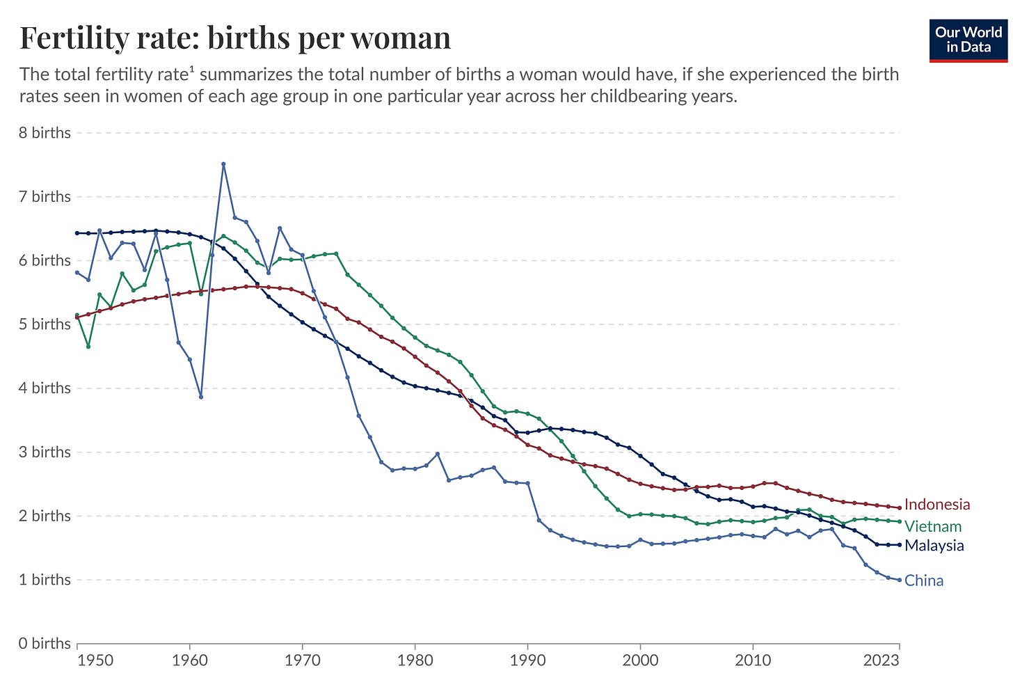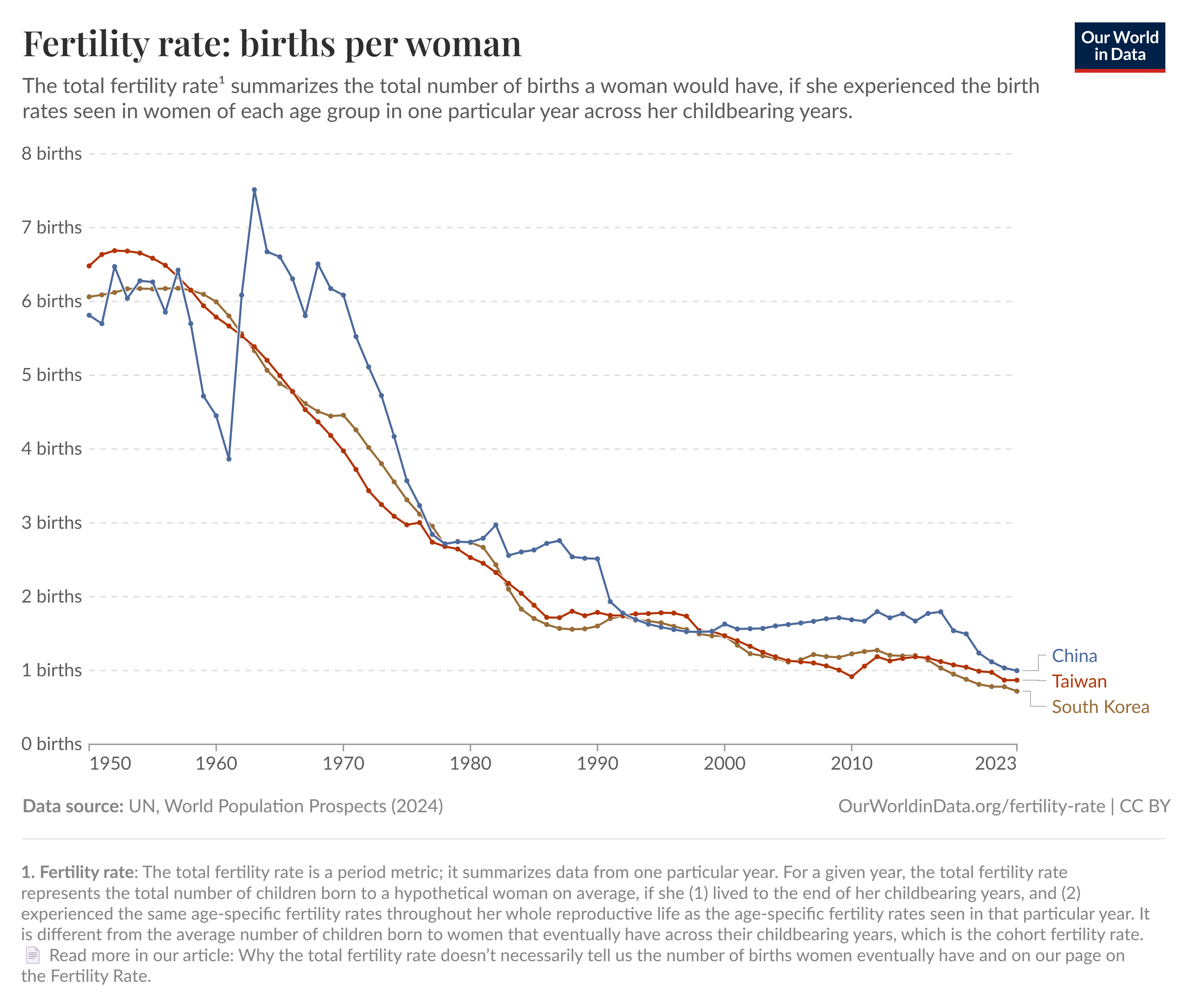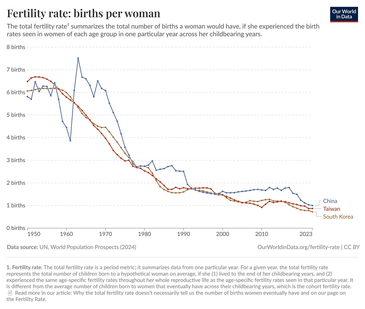 Here we are in 2025, and China is superficially starting to look more like Korea or Taiwan—especially the urban China that is most commonly shared with the outside world, making that fallacious argument look annoyingly realistic. China’s birth rate has dropped to 1 child per woman—somewhere between Japan and South Korea, but before the country has become as rich as her East Asian neighbours.