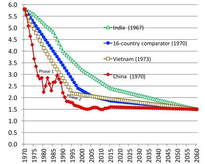 But in reality, this policy was really weird! The "Later, Longer, Fewer" campaign was more radical and coercive in driving down birth rates than it gets credit for. We can see the effect of this policy here, compared to some countries with a similar economic trajectory (many of which also had significant birth control policies!), showing how much of an outlier China was.